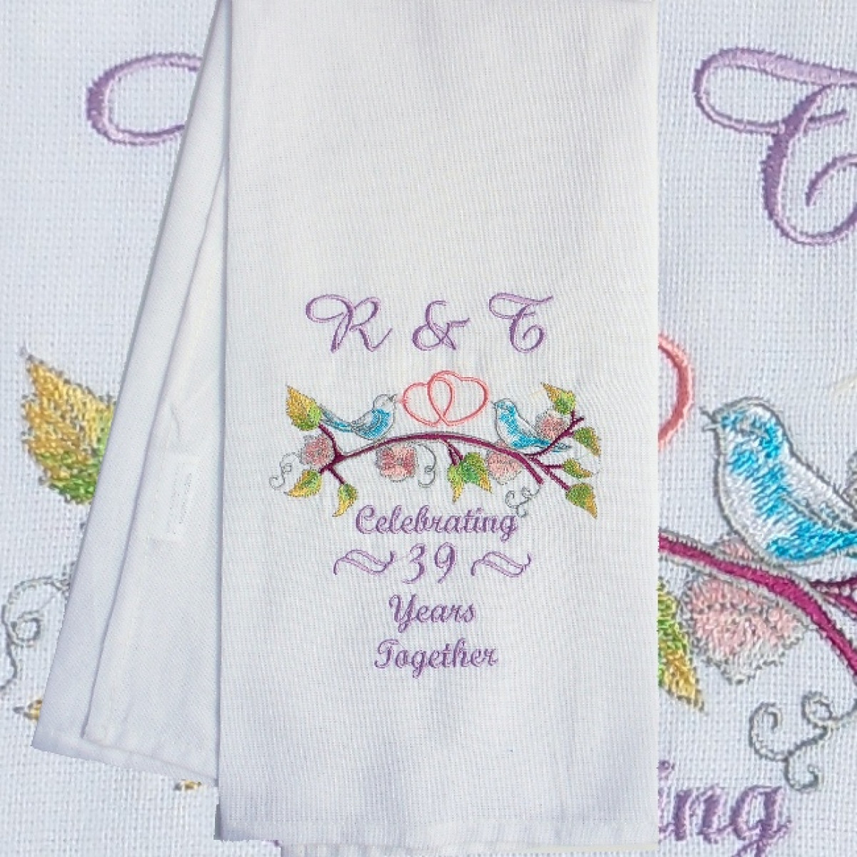 Anniversary Tea Towel Love Birds Embroidered Gift