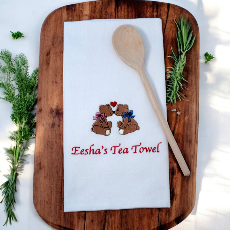 Personalised tea towel featuring an adorable Mr and Mrs Teddy Bear embroidered with names or a littl..