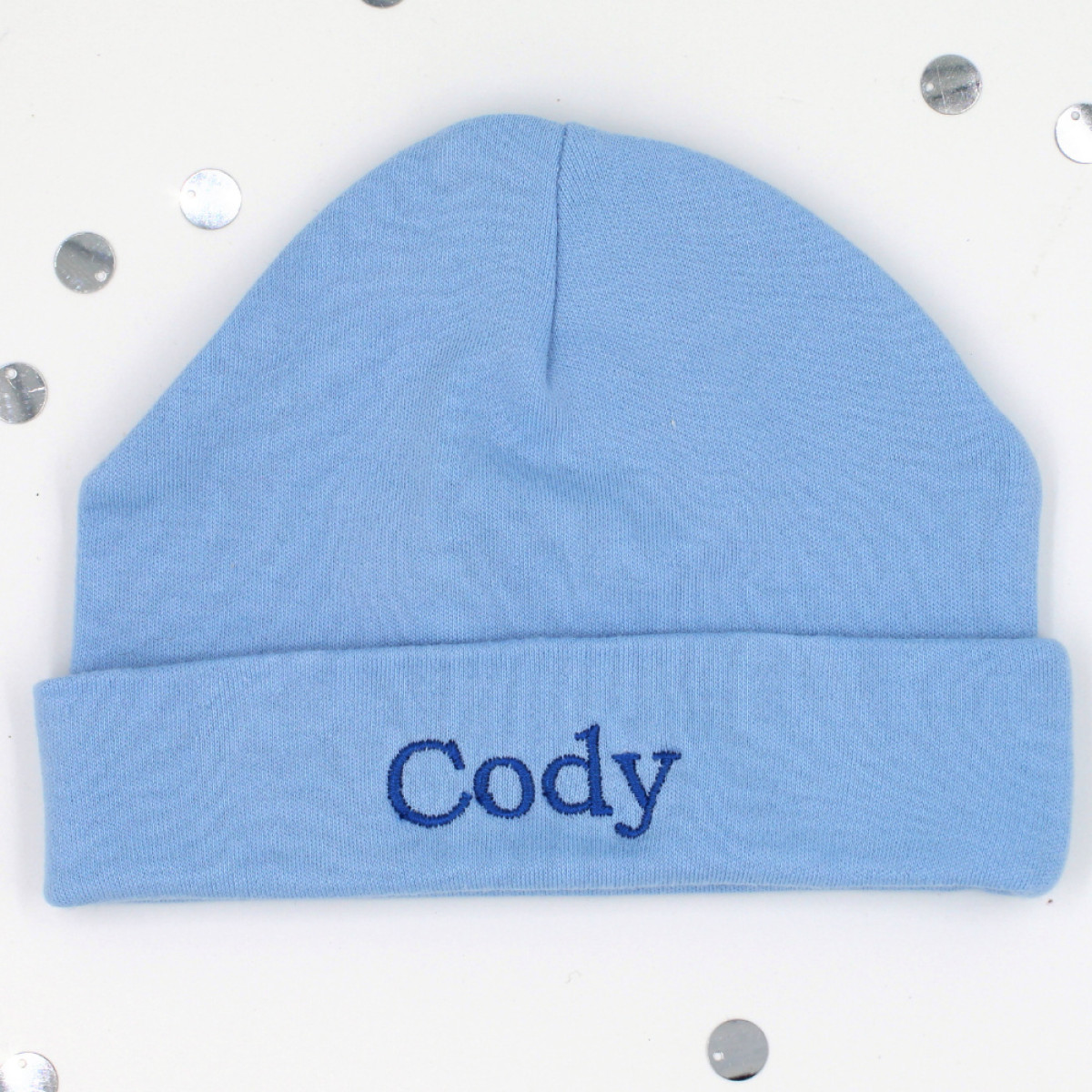 Adorable all cotton baby hat personalised for a special little one. This soft cotton jersey perso..