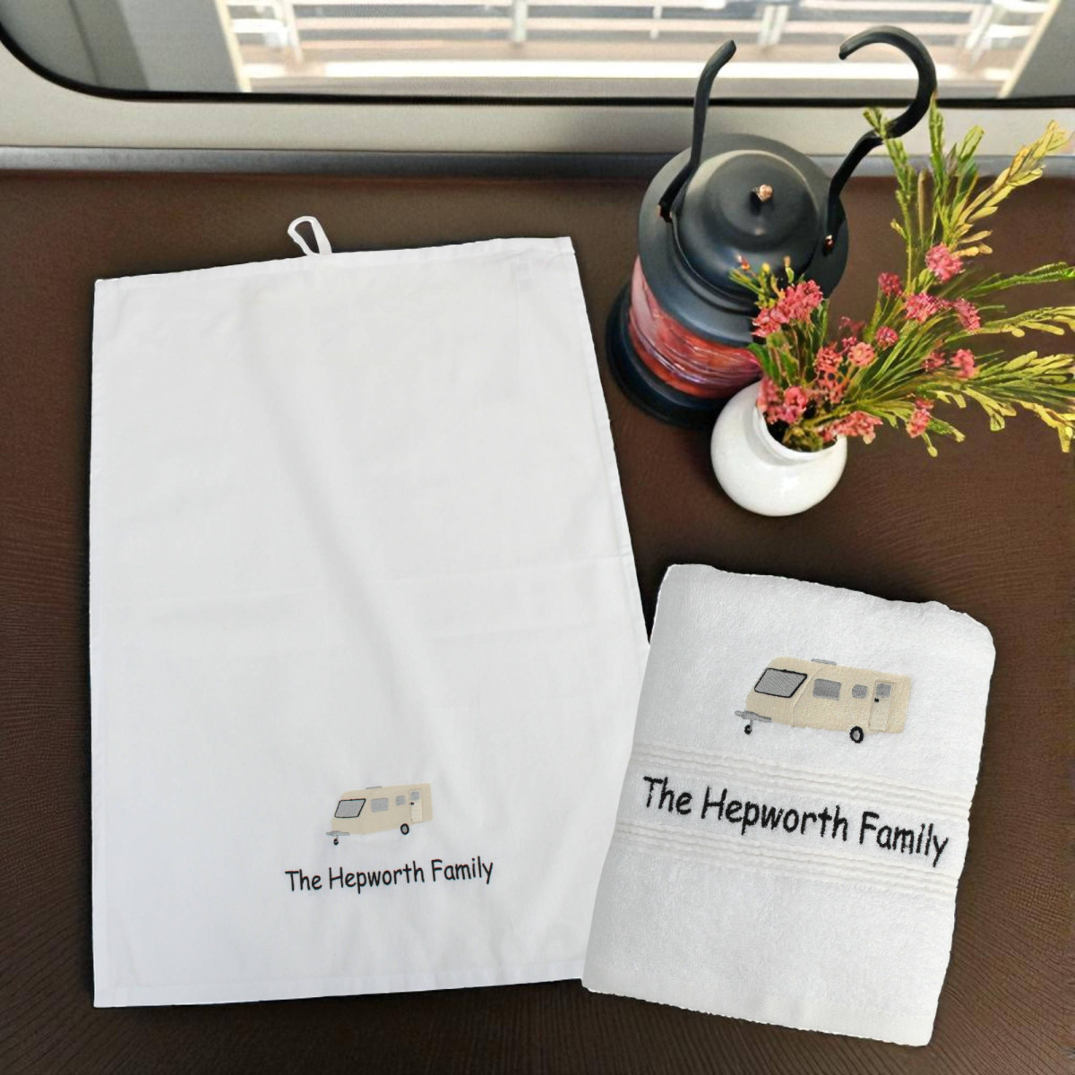 A embroidered caravan design and personalised name(s) on a white cotton tea towel and a white cotton bathroom hand towel.