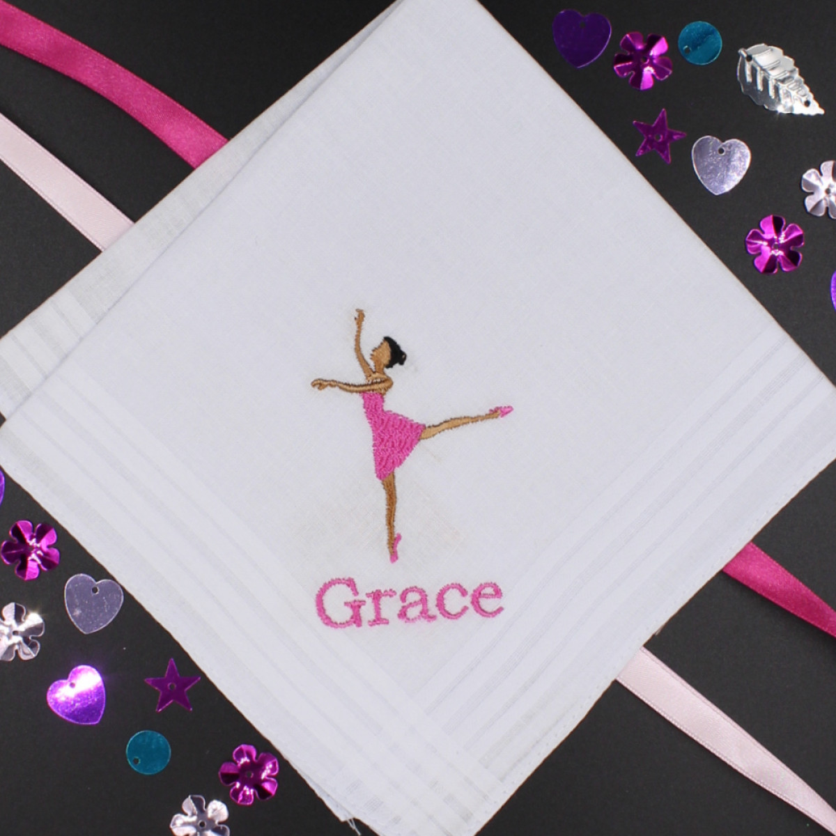 White cotton personalised handkerchiefs featuring a embroidered ballerina in pink dress and ballet shoes, a lovely gift