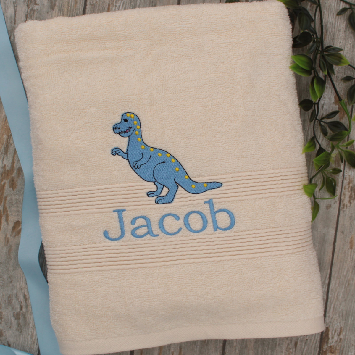 Tags: personalised bath towels childrens towel kids embroidery dinosaurs dino T-Rex Tyrannosaurus Rex Motif