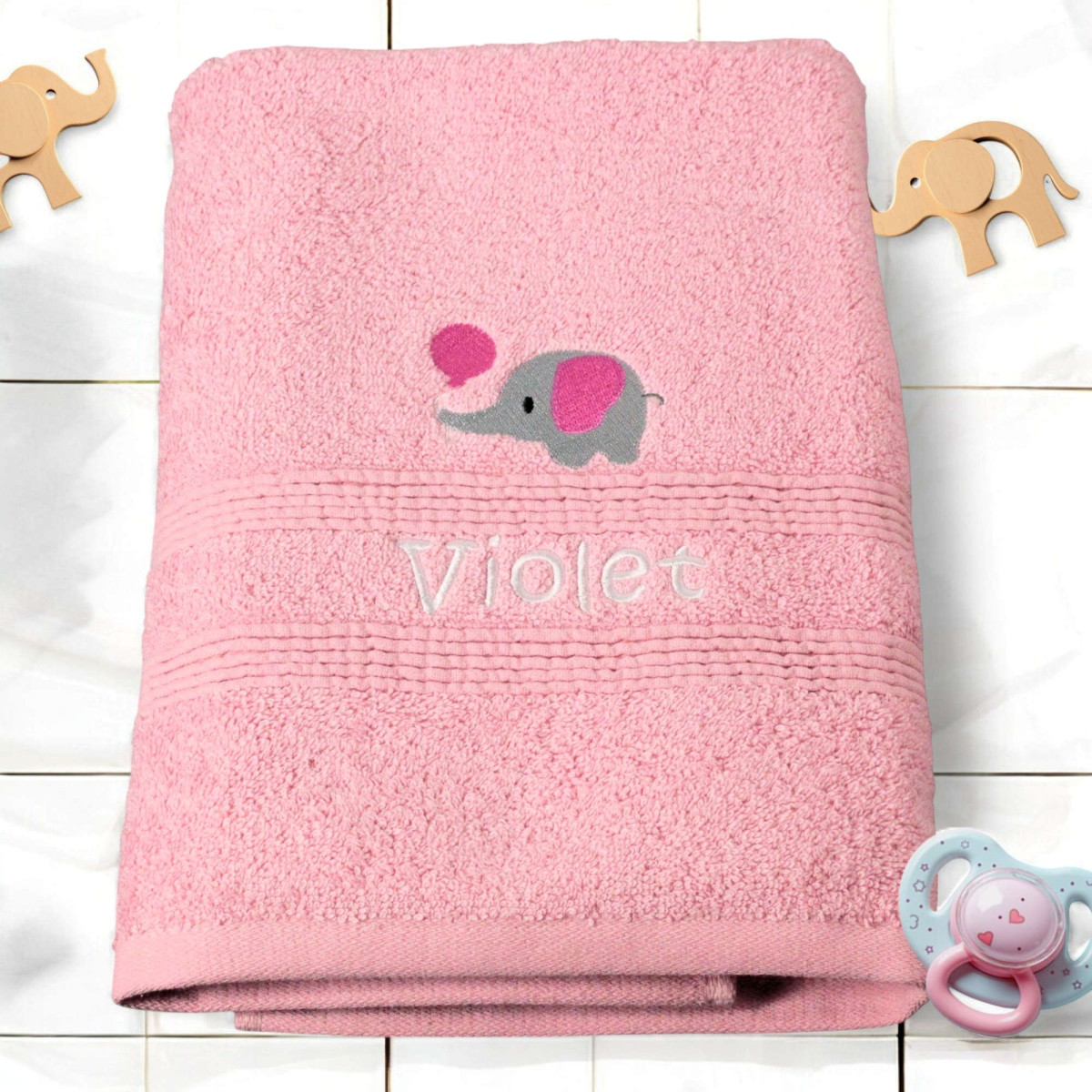 Select the towel colour you would like pink or white. Personalised with your choice of name, nickname or initials. Embroidered in a letter font style and thread colour of your choice. The elephant will be sewn to coordinate with the towel colour and name colour you have selected.