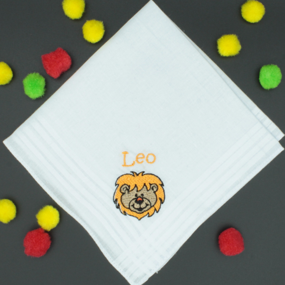 Adorable gift set of 3 white cotton hankies featuring a cute lion head motif and their very own name embroidered on each too.