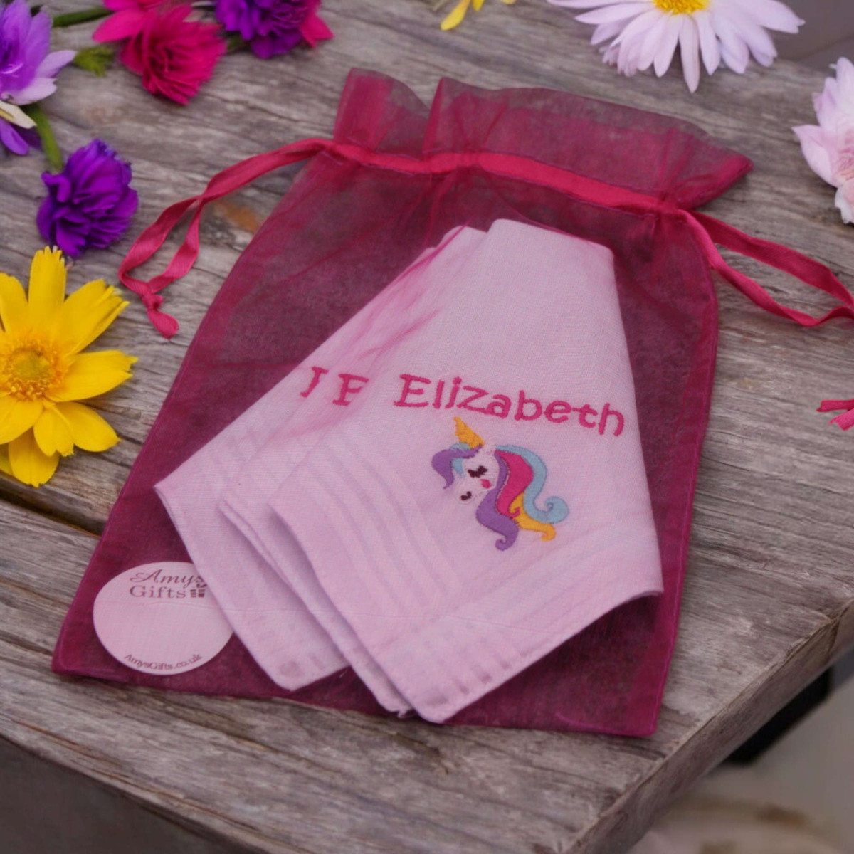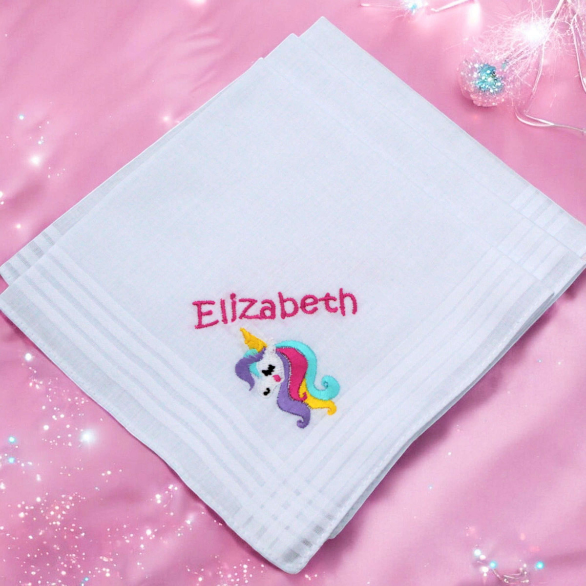 Kids white cotton personalised handkerchiefs featuring a bright unicorn motif and their name in hot pink embroidery.