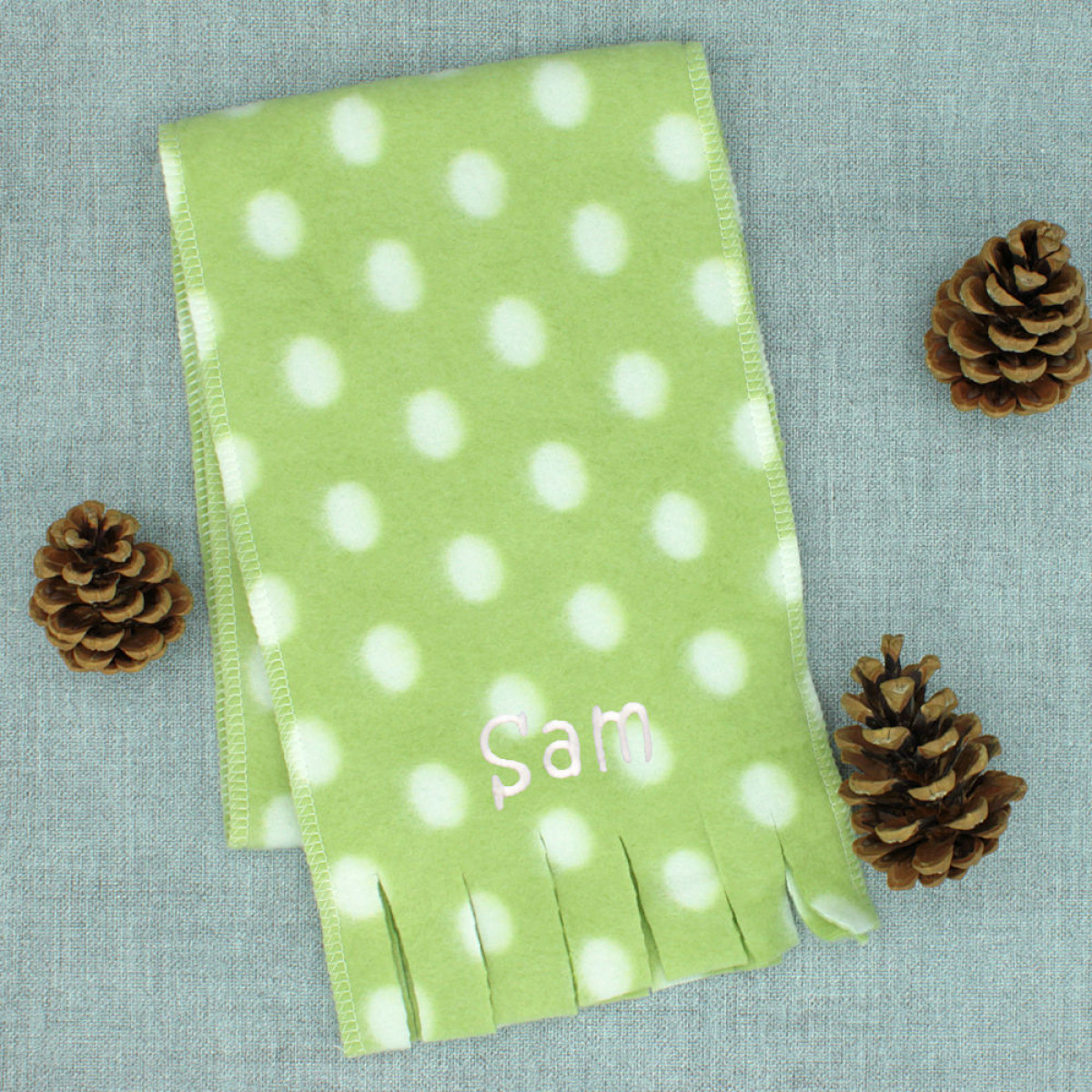 Toddlers little green polka dot fleece scarf personalised with a name or initials. Warm light green with white polka dot