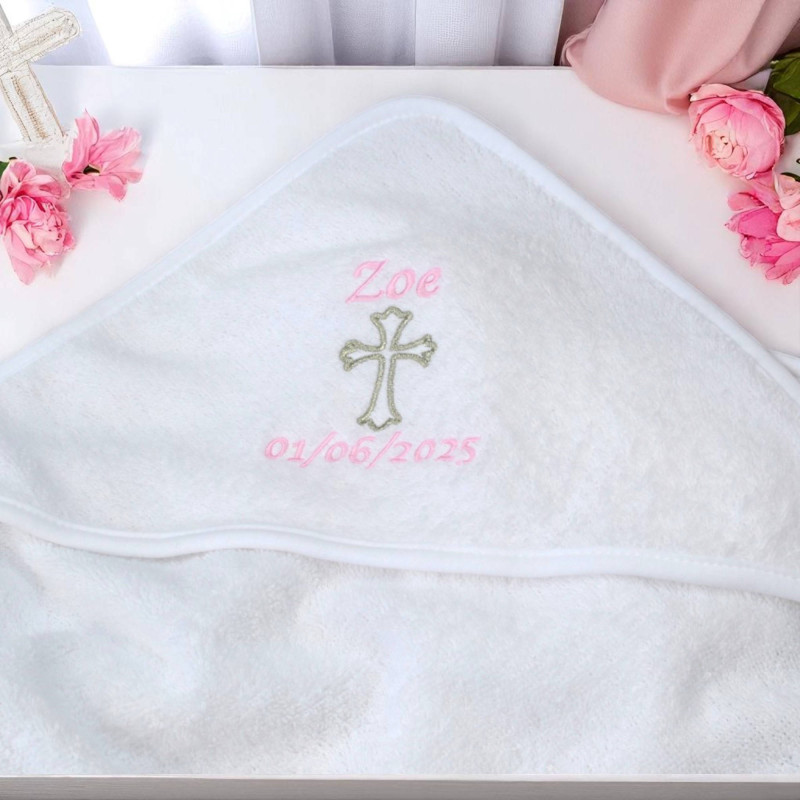 Infant Baptism or Christening hooded towel with embroidered decorative cross motif and an embroidered name of your choice personalised underneath in a thread colour of your choice. The Cross motif can be sewn in shiny metallic Gold or Silver thread or to match the name colour. A lovely white hooded baby towel perfect for infant Christenings, dedication or naming ceremonies. Just fill in a single name or a numerical date for us to embroider and select your preferred font style and text thread colour. You can also choose a colour for the cross motif, metallic thread or can be sewn in the same colour as the text to match. 75x75cm cotton baby towel with hood in white.