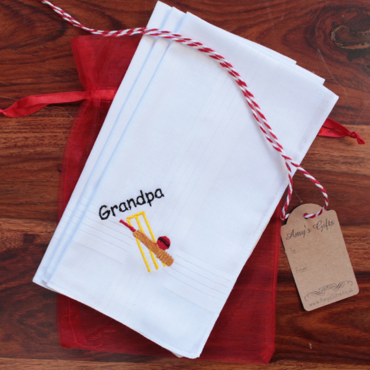 Cricket gift for a sports lover of 3 cotton handkerchiefs personalised with a name or initials of your choice and a cric