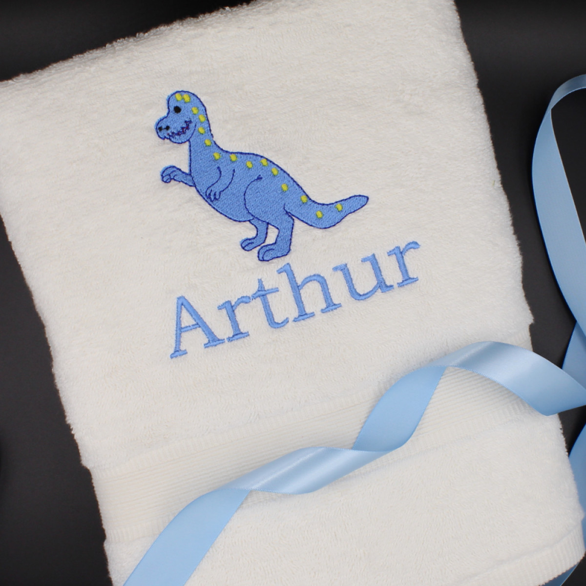 Dinosaur design towel embroidered in colours of your choice with a personalised name. Choose the towel colour. Enter the name. Choose the name text thread colour. Amys Gifts will beautifully embroider your custom designed bath towel. Bath size towel made from soft cotton 70x120cm.
