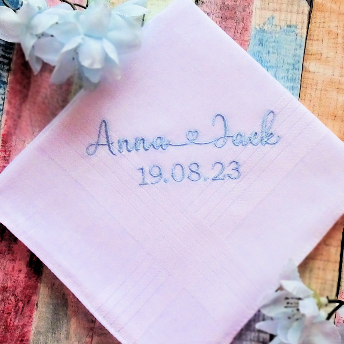 Lovely gift for weddings, anniversaries, announcements, friendships. In the text boxes enter the two names or initials and your own special date to be embroidered. Optional add gift presentation for your personalised handkerchief to be wrapped in.