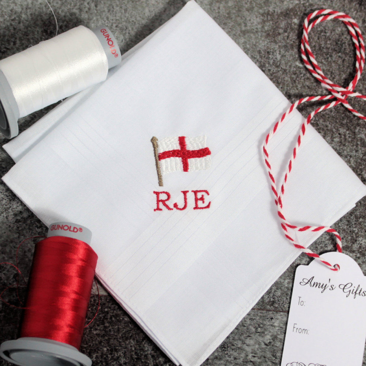 Unique and patriotic mens handkerchiefs gift featuring the English Cross Flag of Saint George national emblem embroidered and personalised initials or name in red.