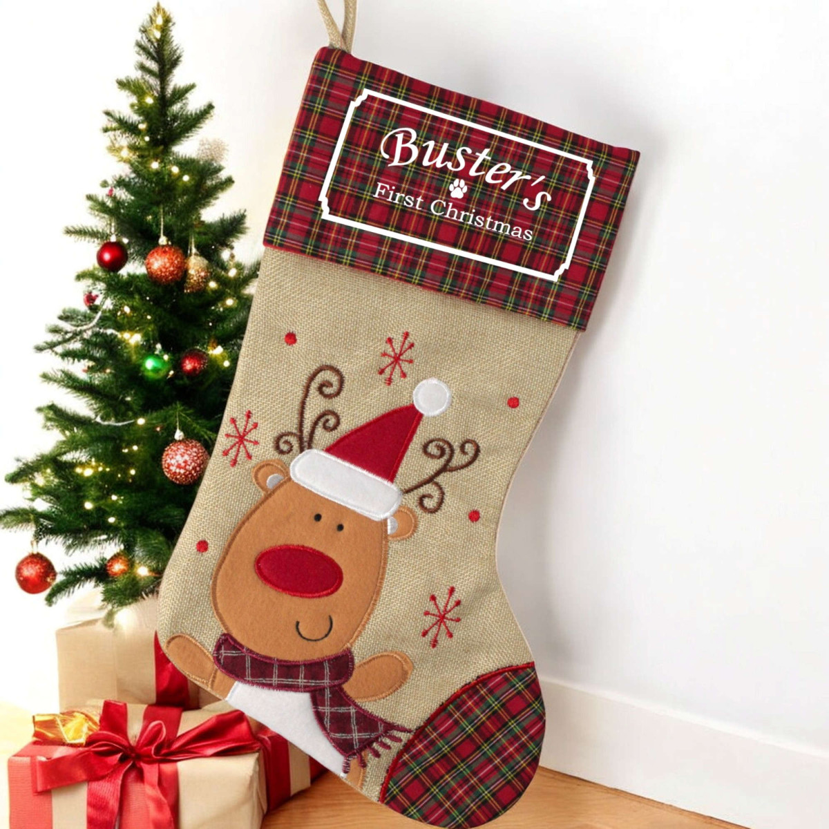 Festive tartan cuffed stocking and a name of your choice printed with a little paw print and First Christmas.