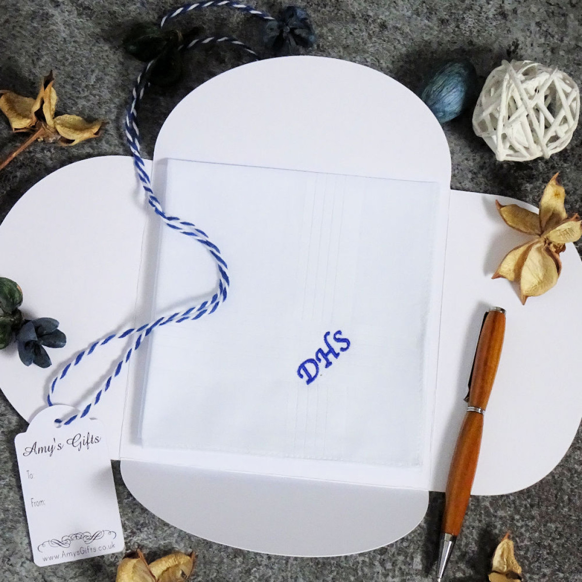 Mens handkerchief gift with embroidered monogram and presented in a sophisticated white gift envelope.