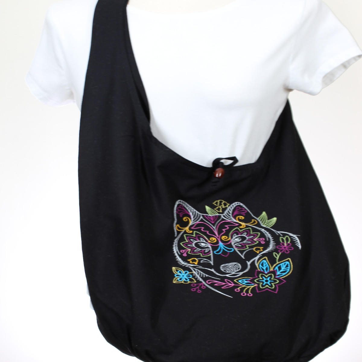 Hobo Chic Sling Bag Embroidered Deco Wolf Eco Cotton Bag