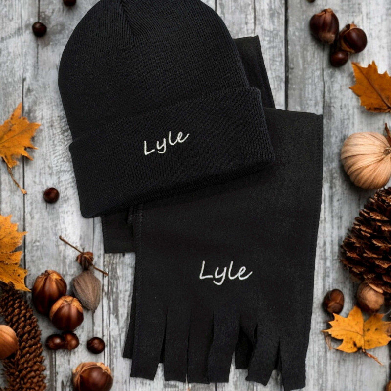 Optional to have this scarf and hat personalised with a name or initials embroidered in your choice of thread colour.