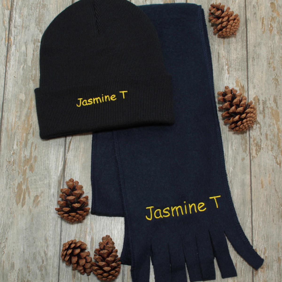 Optional to have this scarf and hat personalised with a name or initials embroidered in your choice of thread colour.