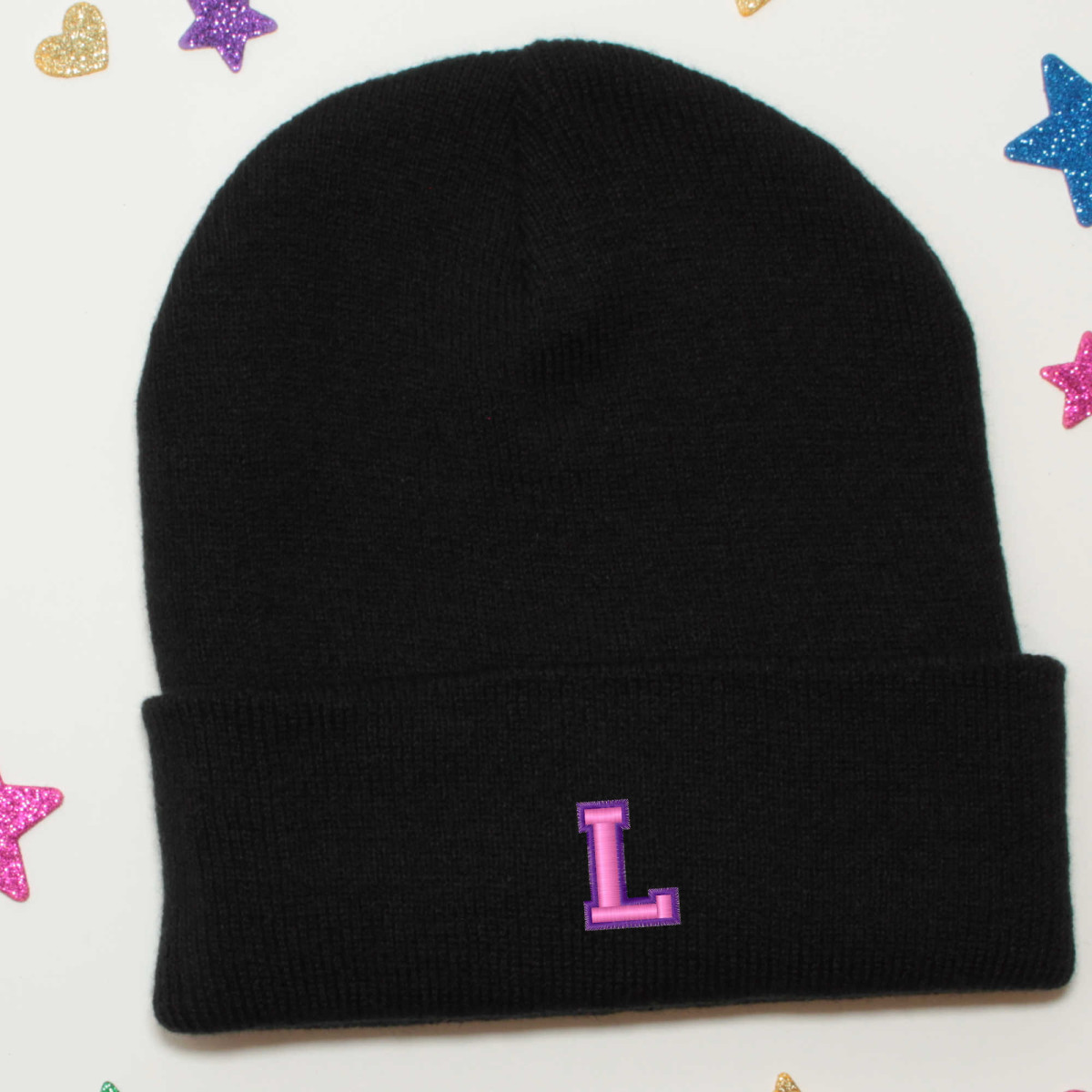 Kids cosy beanie hats personalised with their own initial on the cuff. Fun design embroidered cuffed beanie to keep litt