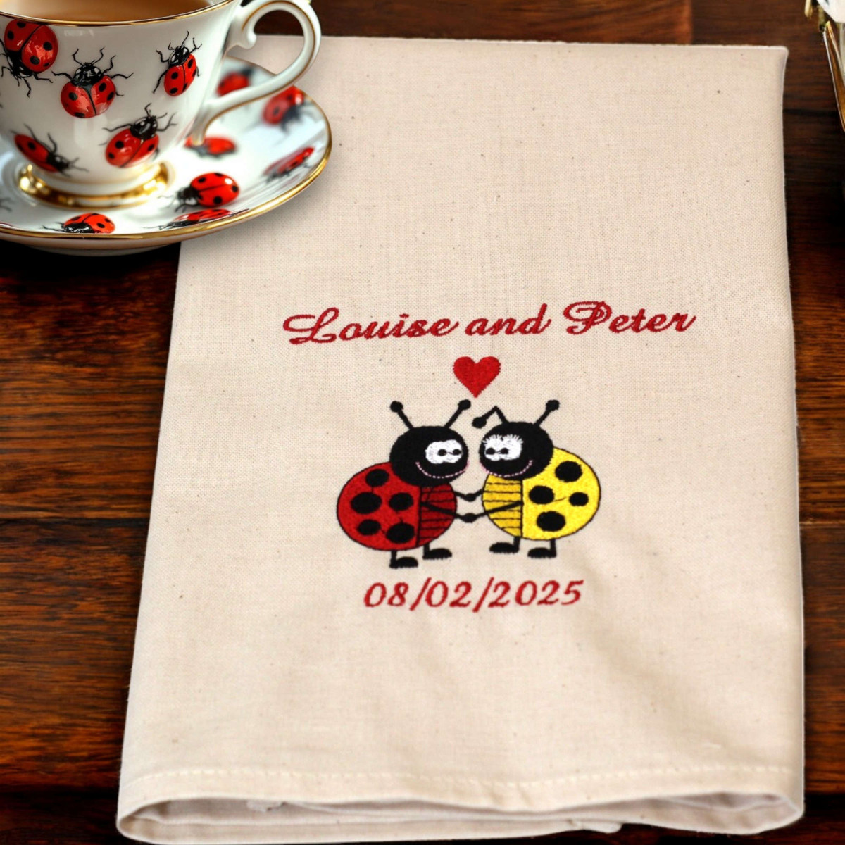 Personalised tea towel featuring an adorable Love Bug motif and embroidered with names or a little m..