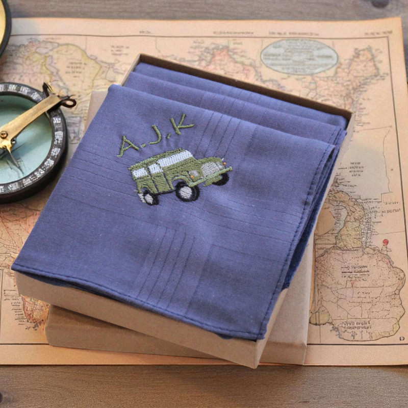 Three Landrover navy blue handkerchiefs personalised with a name or initials embroidered.