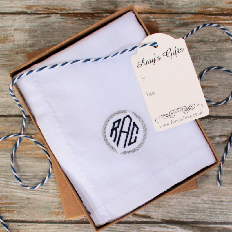 Mens handkerchief gift with embroidered monogram and presented in a sophisticated white gift envelop..