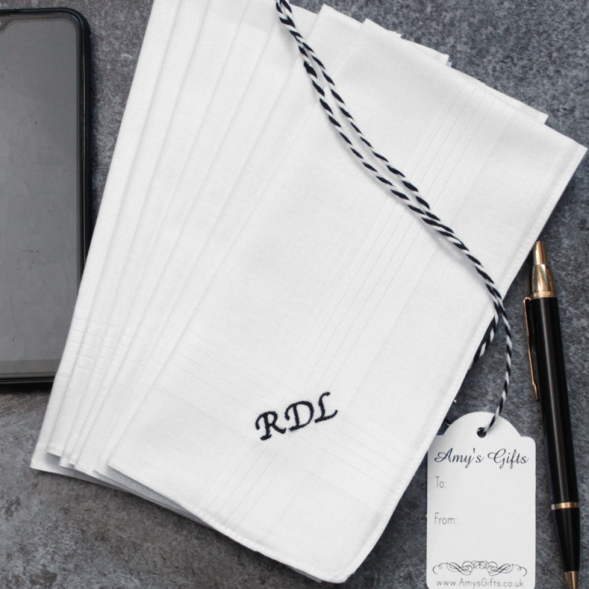 Three personalised embroidered mens white cotton handkerchiefs set. You get three white cotton men..