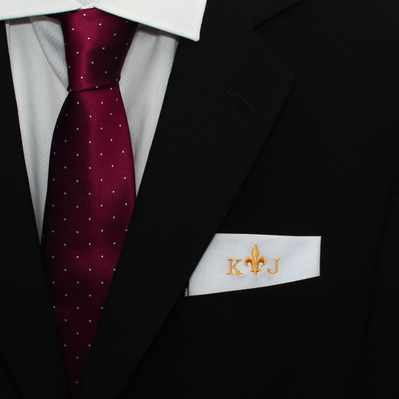 Mens White Cotton Pocket Square Custom Embroidered Initials & Emblem