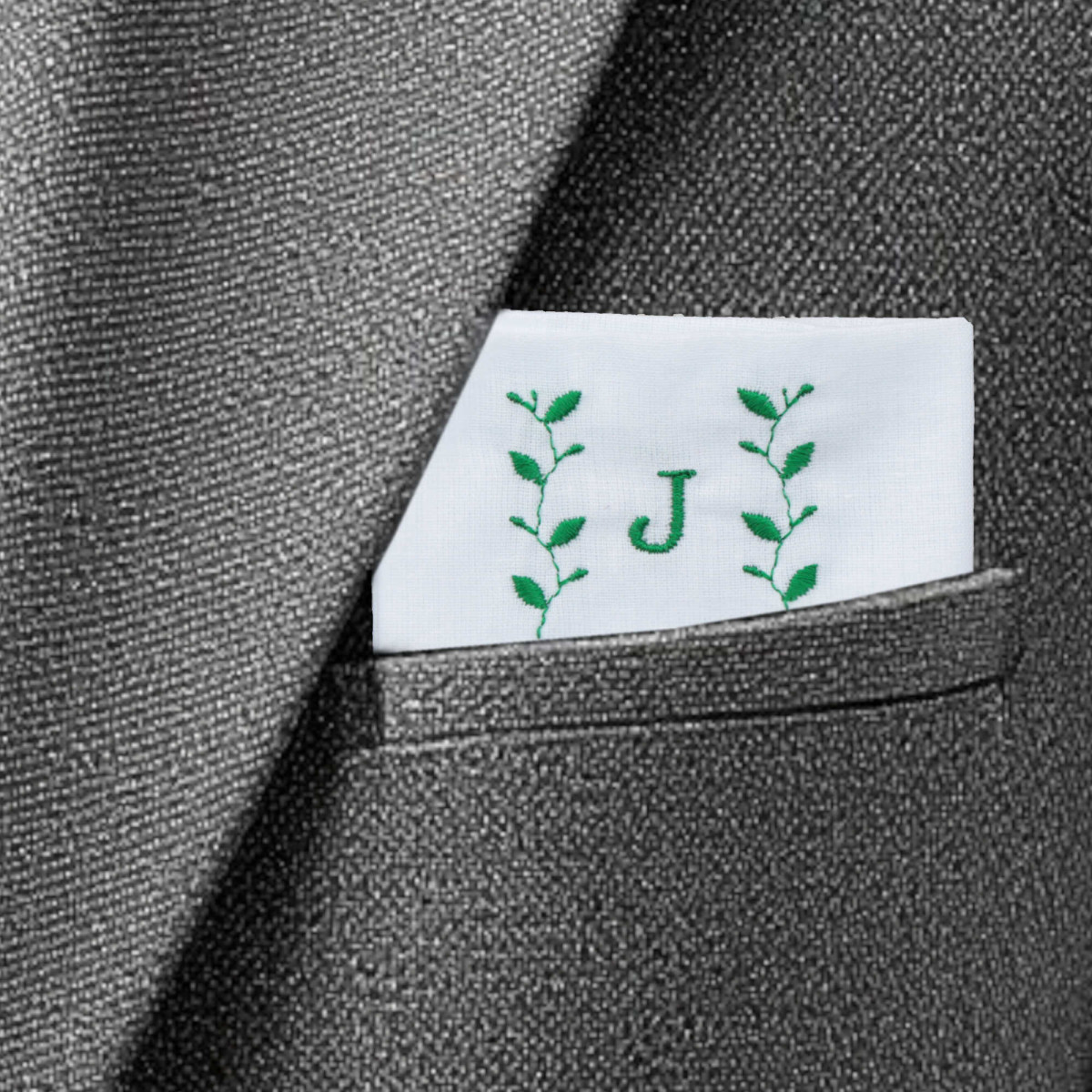 Embroidered cotton pocket square handkerchief with personalised monogram and motif border for display in a jacket pocket