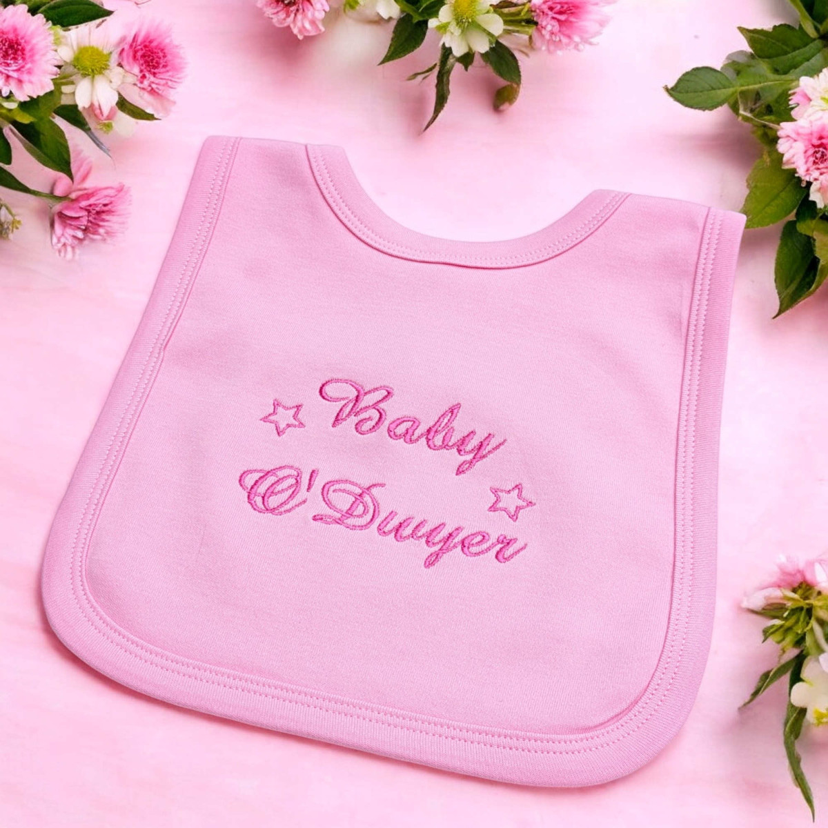 UK made soft double jersey cotton baby bib in your choice of colour personalised with an embroidered name and two little stars.