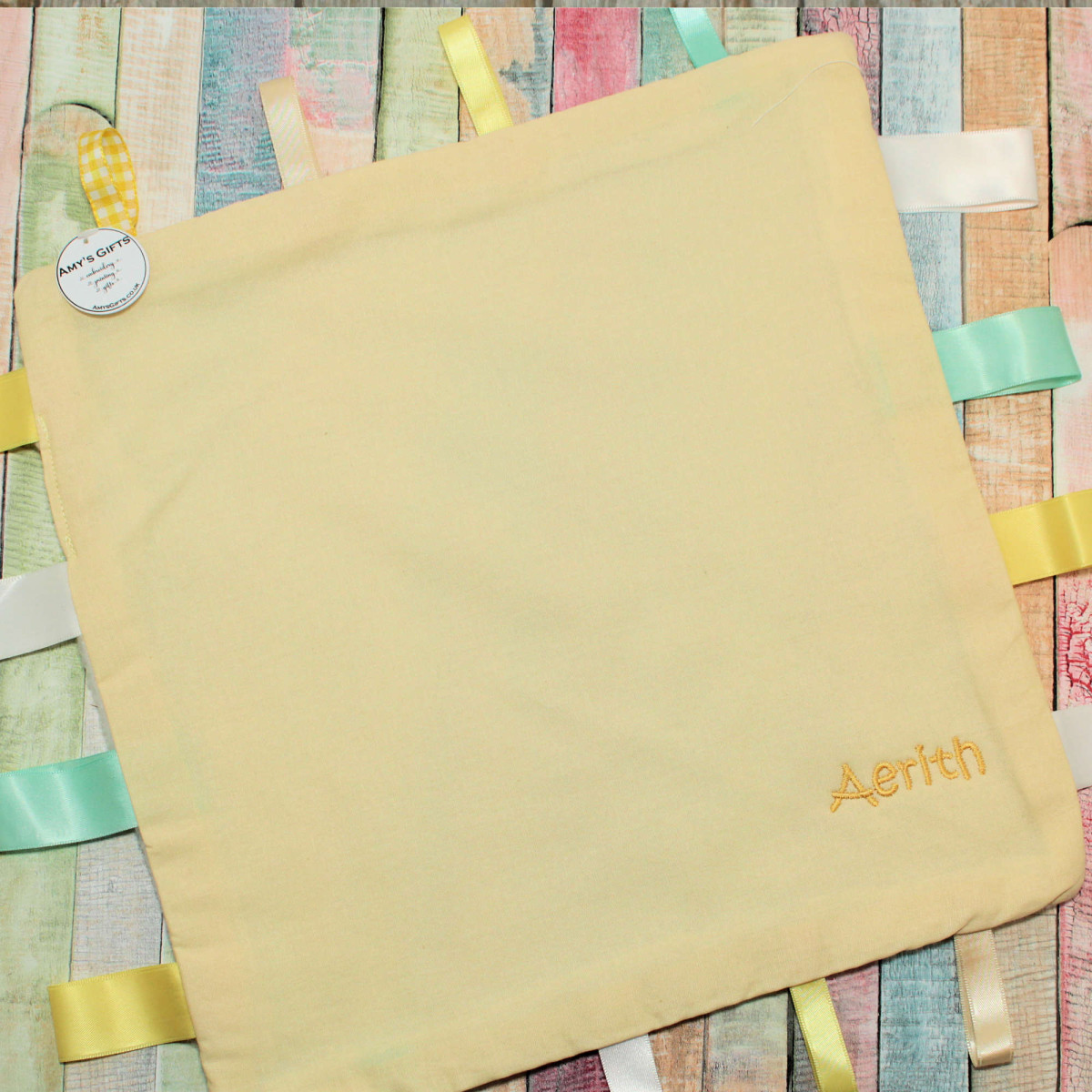 Adorable yellow comforter blankie with colourful ribbon taggies that is made special with a personalised name to one corner too.
