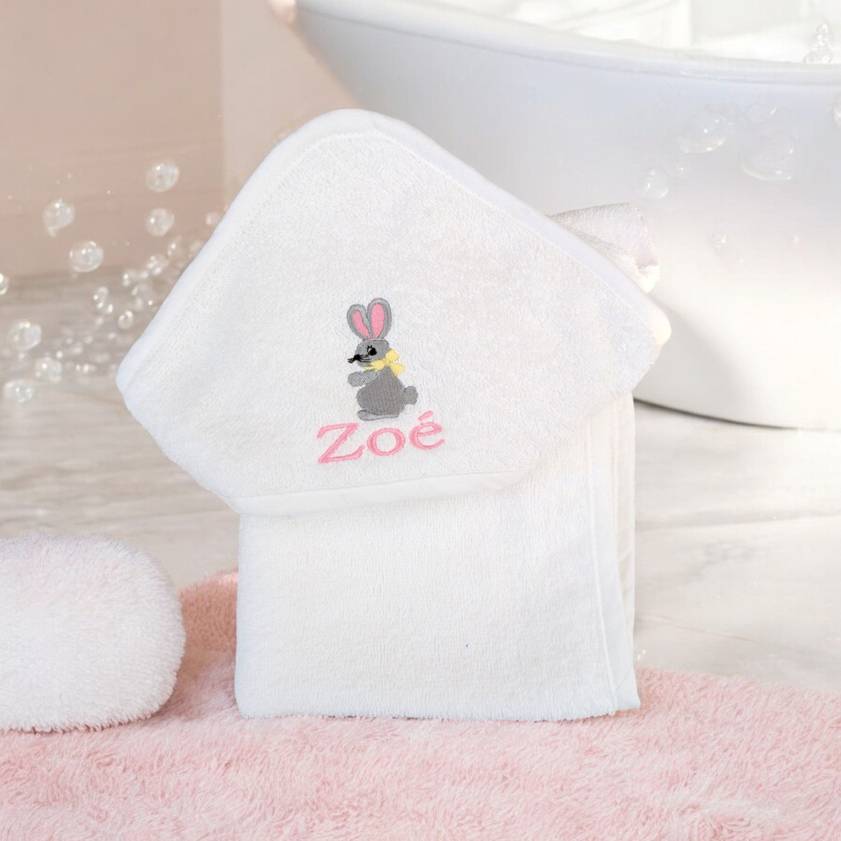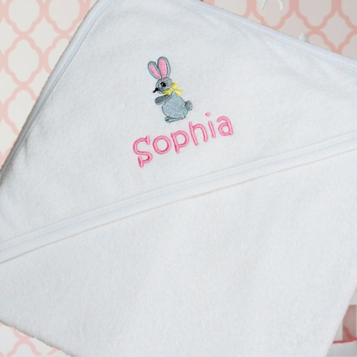 White hooded baby towel cuddle robe featuring exclusive embroidered bunny rabbit design and you can choose to have made