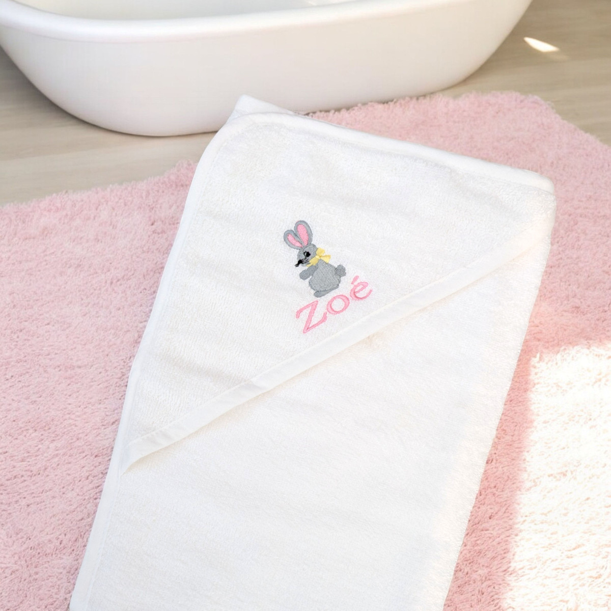 White hooded baby towel cuddle robe featuring exclusive embroidered bunny rabbit design and you can choose to have made special with babies name personalised with embroidery.