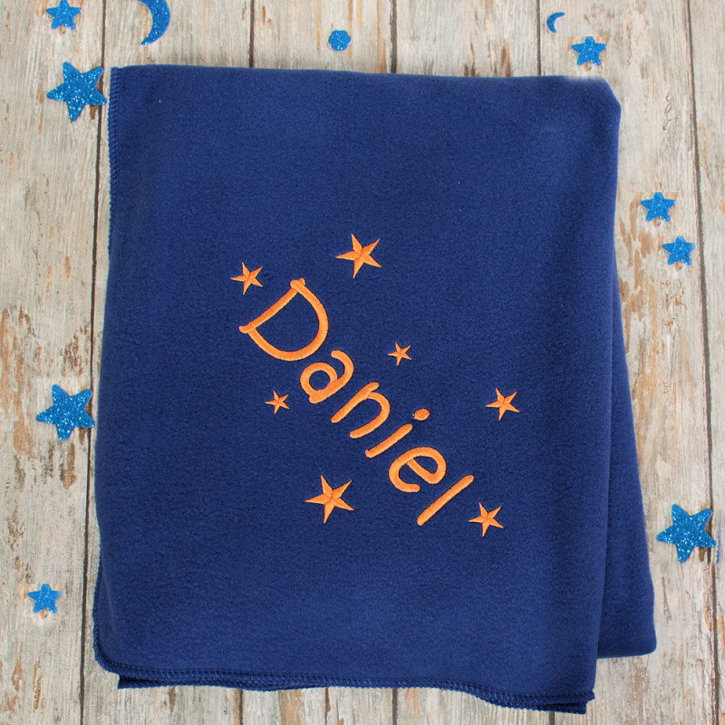Personalised fleece throw blanket in your choice of colour and size embroidered with a personalised name surrounded by scattered stars. Choose your blanket colour and size, a Single 100x150 cm or a Double size 200x150 cm. All sizes are measured approximate.