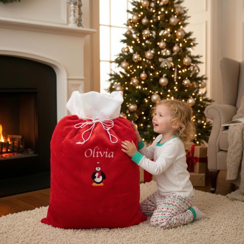 Personalised plush fur Christmas Santa Sack with custom penguin embroidery and name in your choice of font style. Festiv