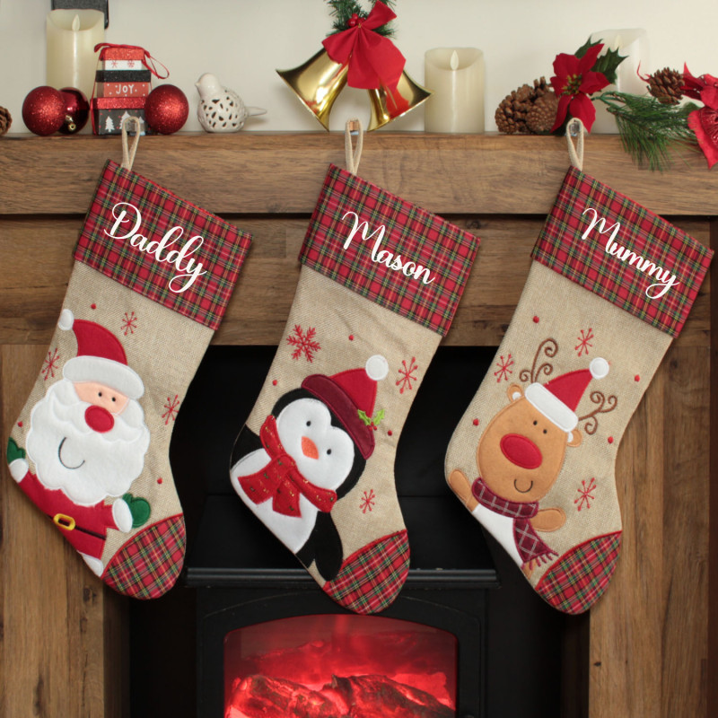 Personalised Santa Christmas Stocking festive tartan cuff and toe with snowflake embroidery and plush character. A cheerful bright Christmas stocking measuring 46cm top to toe length and 22cm brim diameter. The stocking is nice quality hessian and red and green tartan cotton fabric and is fully lined on the inside. This stocking will look fantastic on Christmas morning filled with those great stocking fillers.