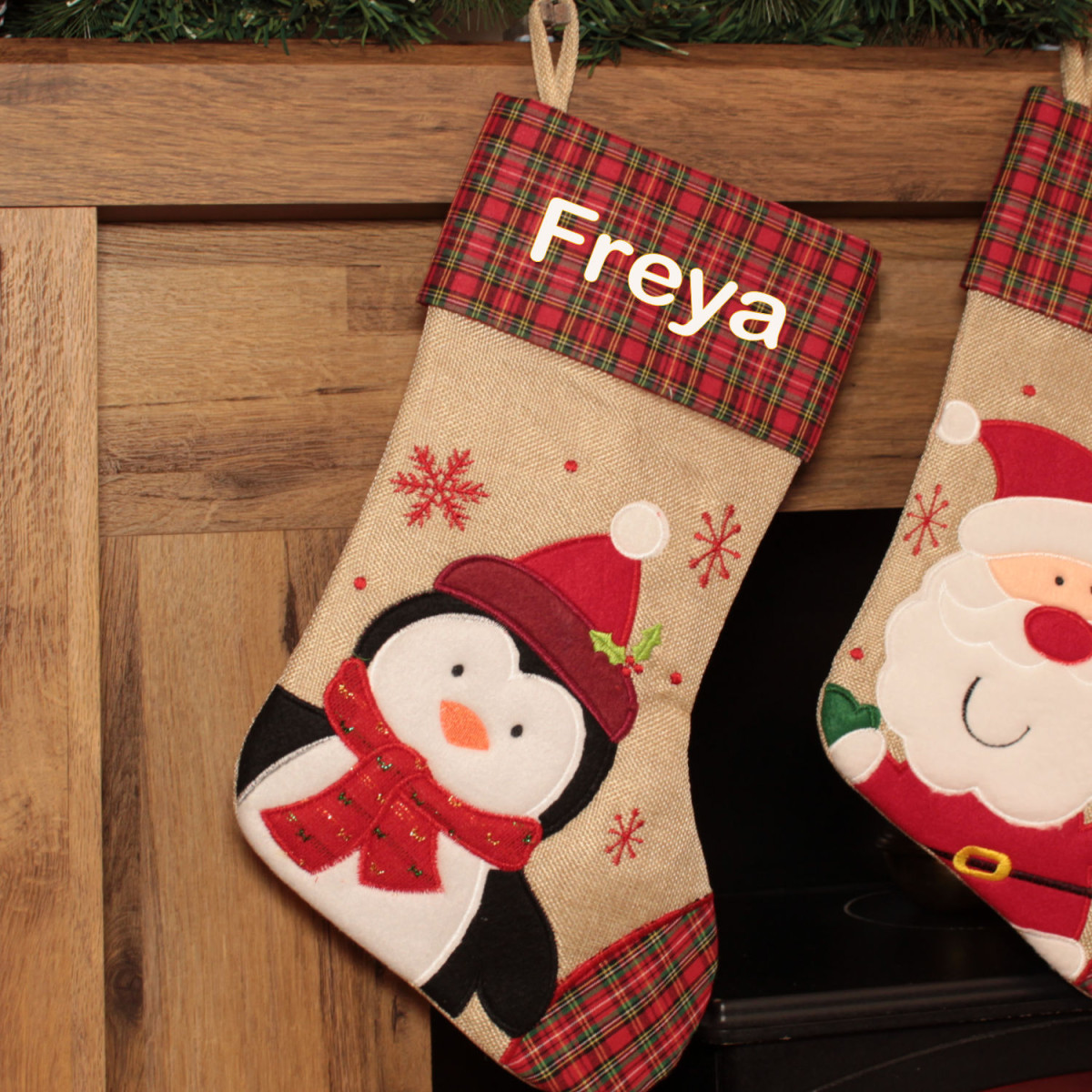 Personalised Christmas Stocking with festive tartan cuff and toe with snowflake embroidery and plush character of your choice. A cheerful bright Christmas stocking measuring 46cm top to toe length and 22cm brim diameter. The stocking is nice quality hessian and red and green tartan cotton fabric and is fully lined on the inside. This stocking will look fantastic on Christmas morning filled with those great stocking fillers.