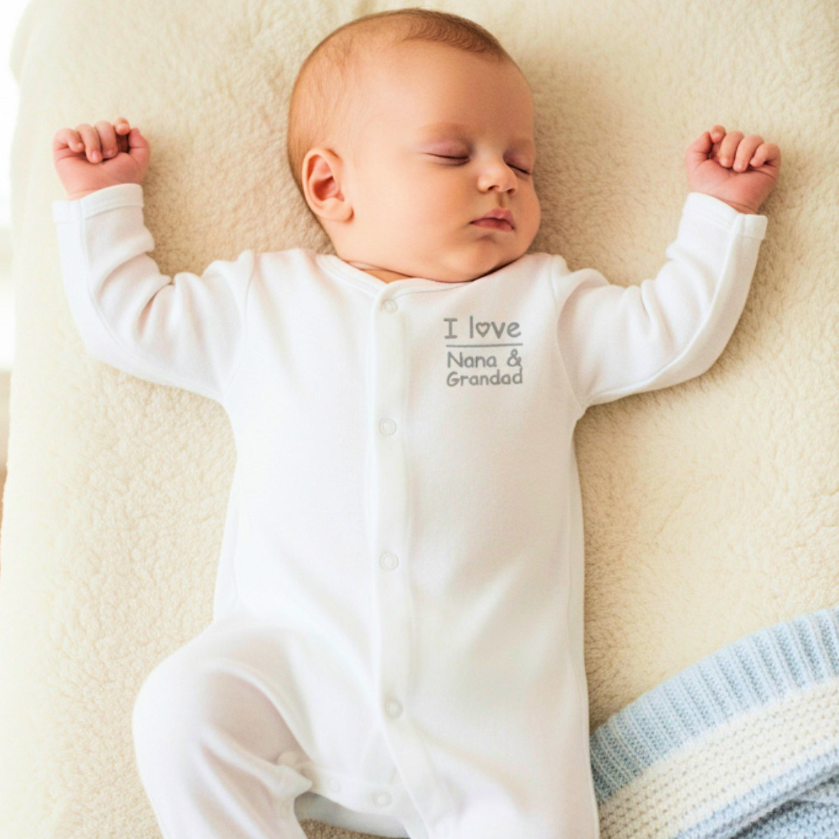 Personalised with I love... and any name or nickname on this soft white cotton baby sleepsuit. I love - Nana & Grandad Read more →