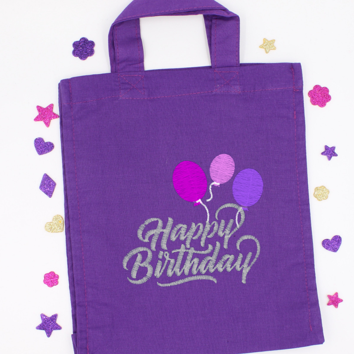 Mini cotton gift bag embroidered with Happy Birthday and ballons motif that can be personalised with a name too.