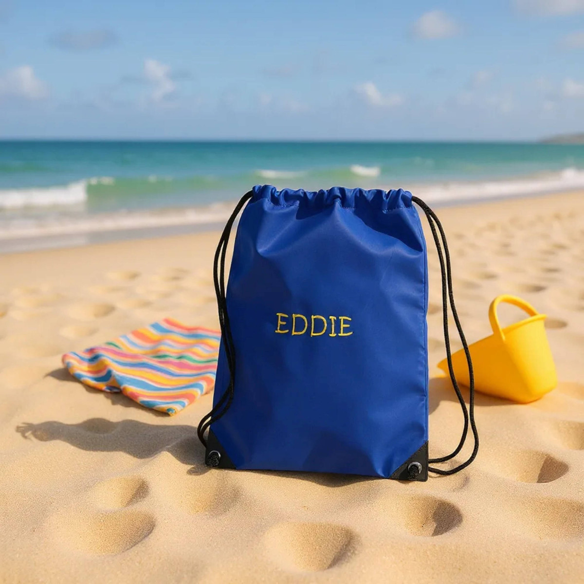 Tags: personalised gym bag, royal blue drawstring bag, school sports PE bag, embroidered name bag, kids name PE sack, custom sports kit bag, swim bag with name, lightweight nylon gym sack, back to school gift, person