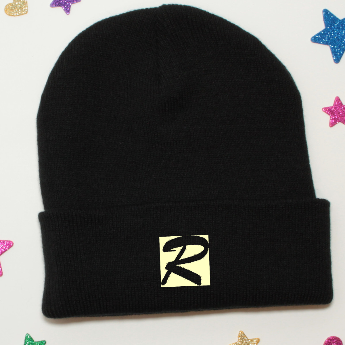 Childs custom-made knitted stretch beanie with folded cuff to fit juniors approx ages 5-11 years old! Made from super-soft, 100% acrylic yarn. Personalised by quality HTV printing with a single initial in a coloured box, making a funky personal gift. The Initial is inverted and the text colour of your choice surrounds the letter.