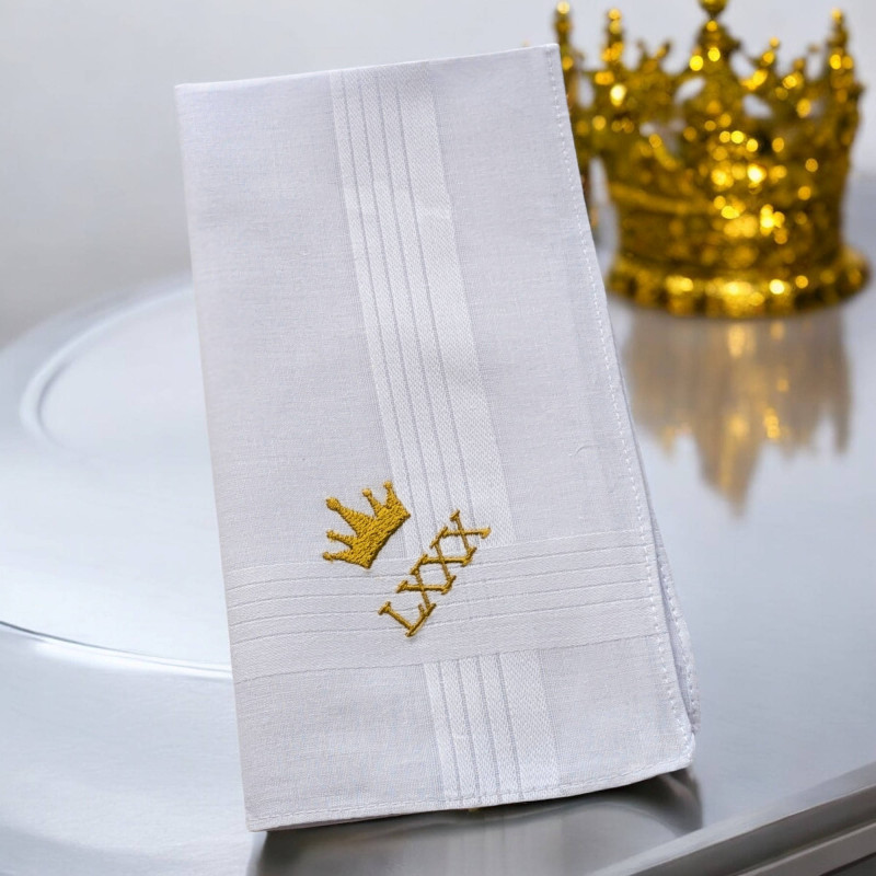 A dark gold royal crown embroidered over a personalised name or initials in a thread colour and font style of your choice. Set of 3 matching hankies, approx 40cm size mens white cotton classic handkerchiefs.