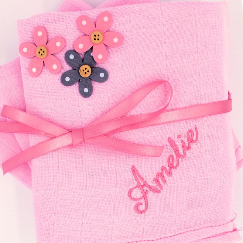 Baby gift set of 3 pink cotton muslins squares beautifully embroidered with baby's name across one corner of each. Unique and very useful gift set for mothers and their babies.