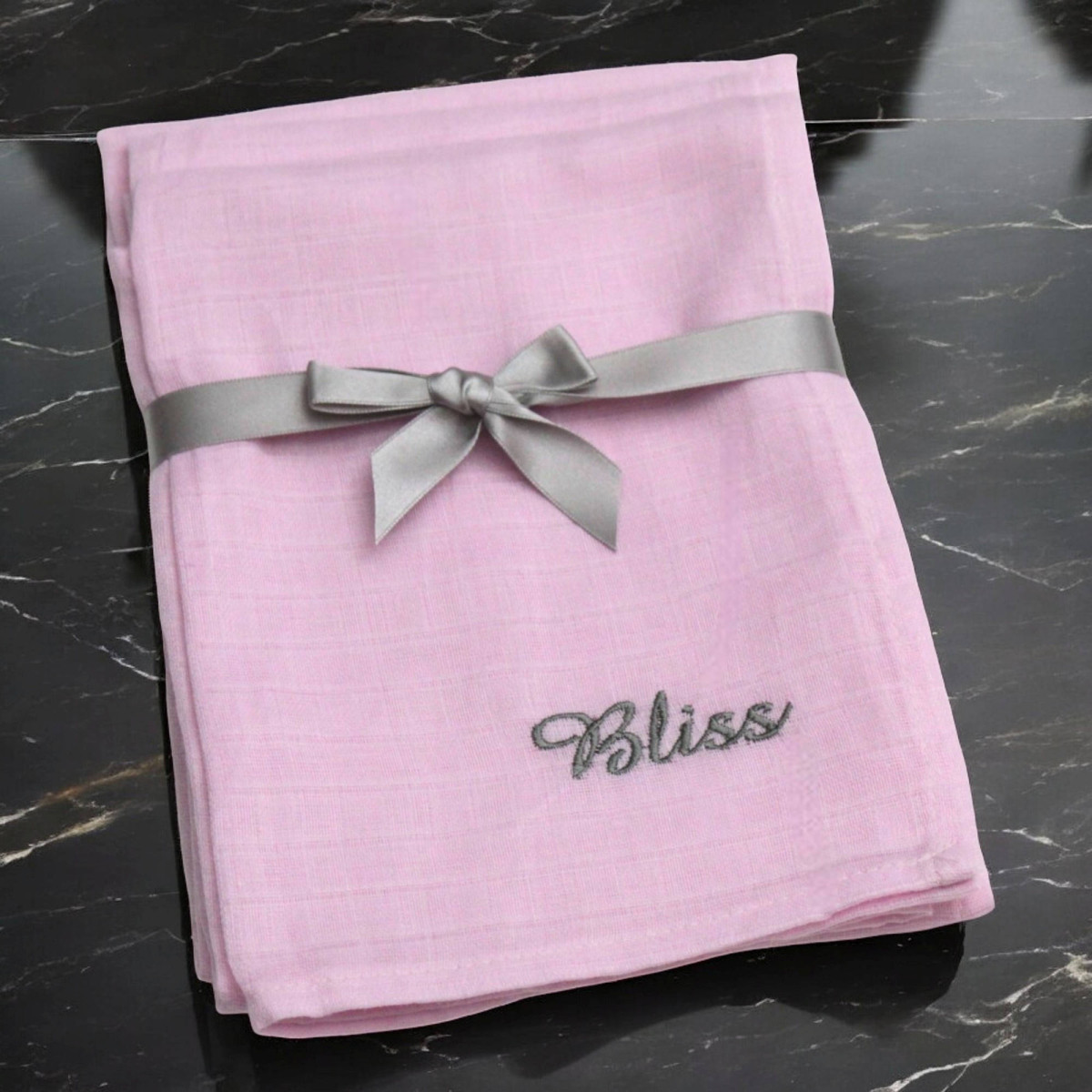 We will personalise each muslin square with a name or initials embroidered across the corner in a letter font style and thread colour of your choice.