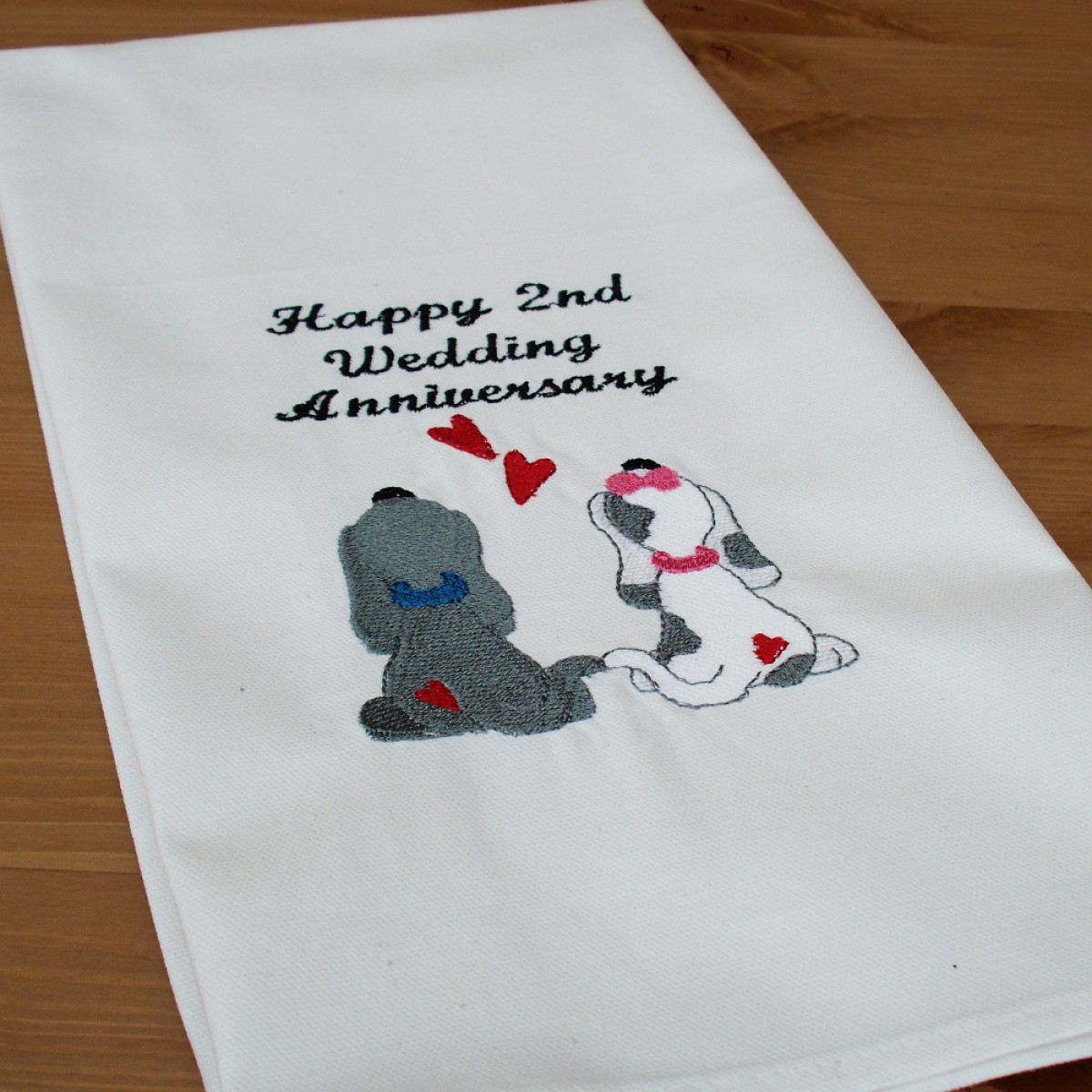 Puppy love personalised cotton anniversary tea towel embroidered with the numbers of years for the a..