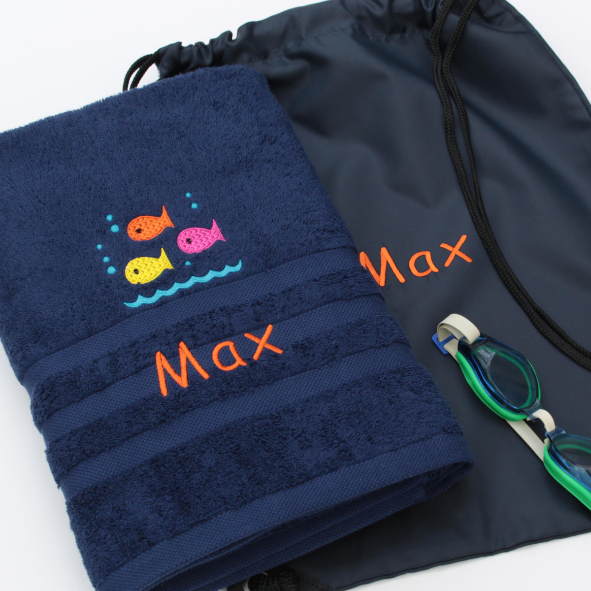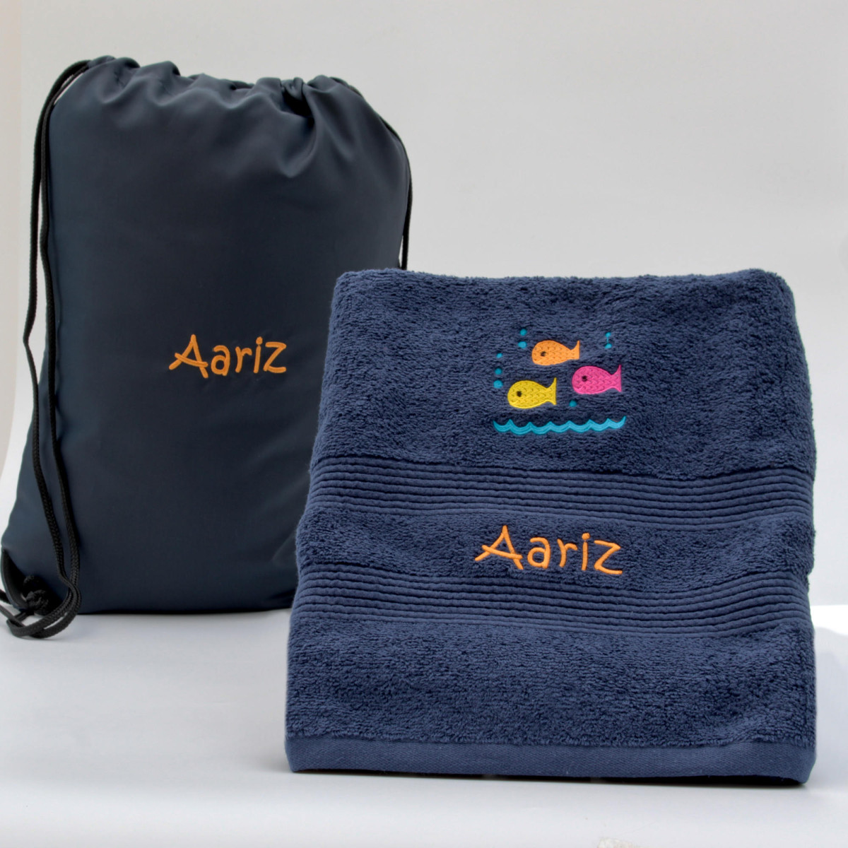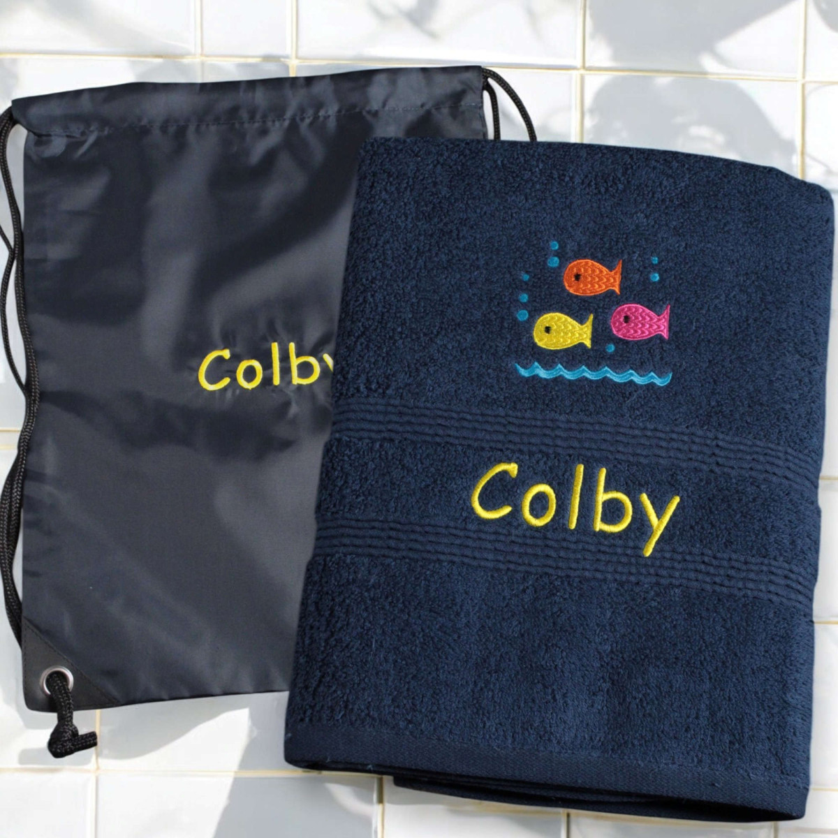 Tags: Personalised swim towel, Swimming towel, Fish design towel, Beach towel, Customised towel, Cotton towel, Swim gear, Poolside, Gift for swimmers, navy towel and bag, fishes