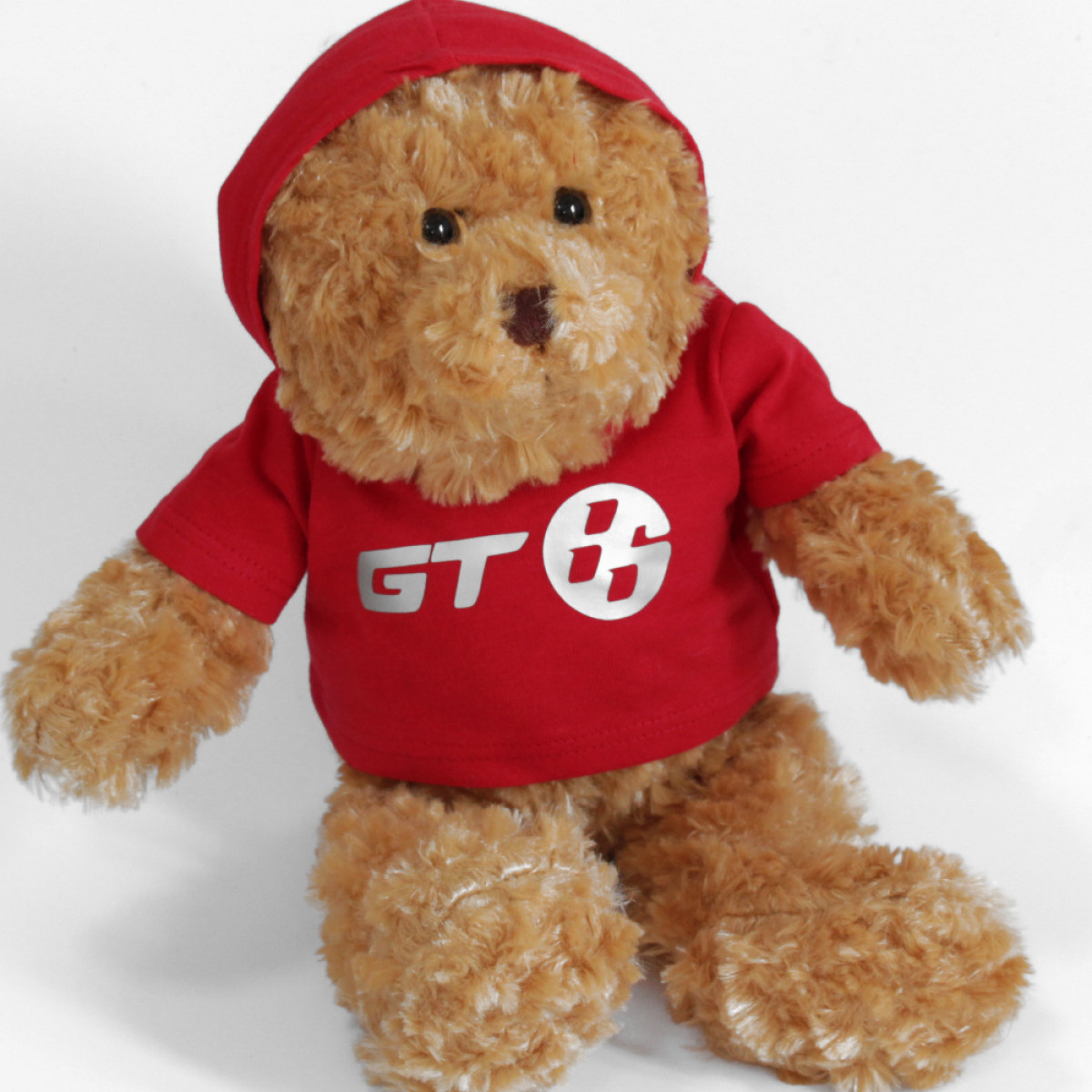 Personalised Mumbles teddy bear with vinyl printed red hooded t-shirt. Please email us your single colour logo.