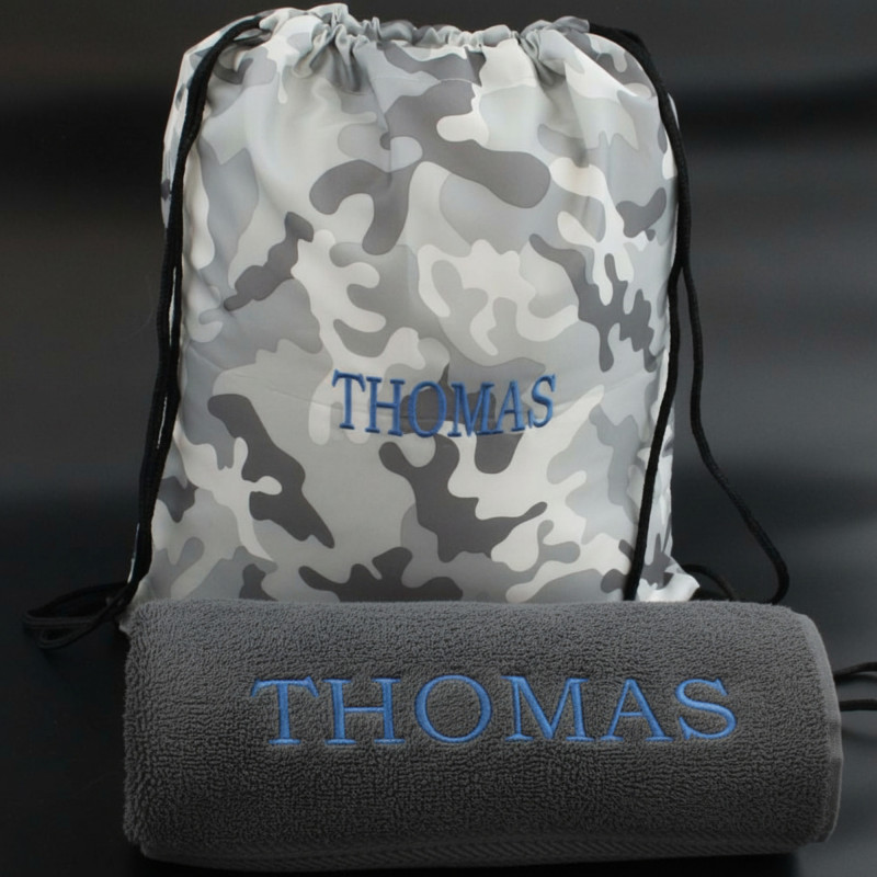 Tags: camo, sports, gym, swim, swimming, pe, school, grey towel set, swim towel and bag.