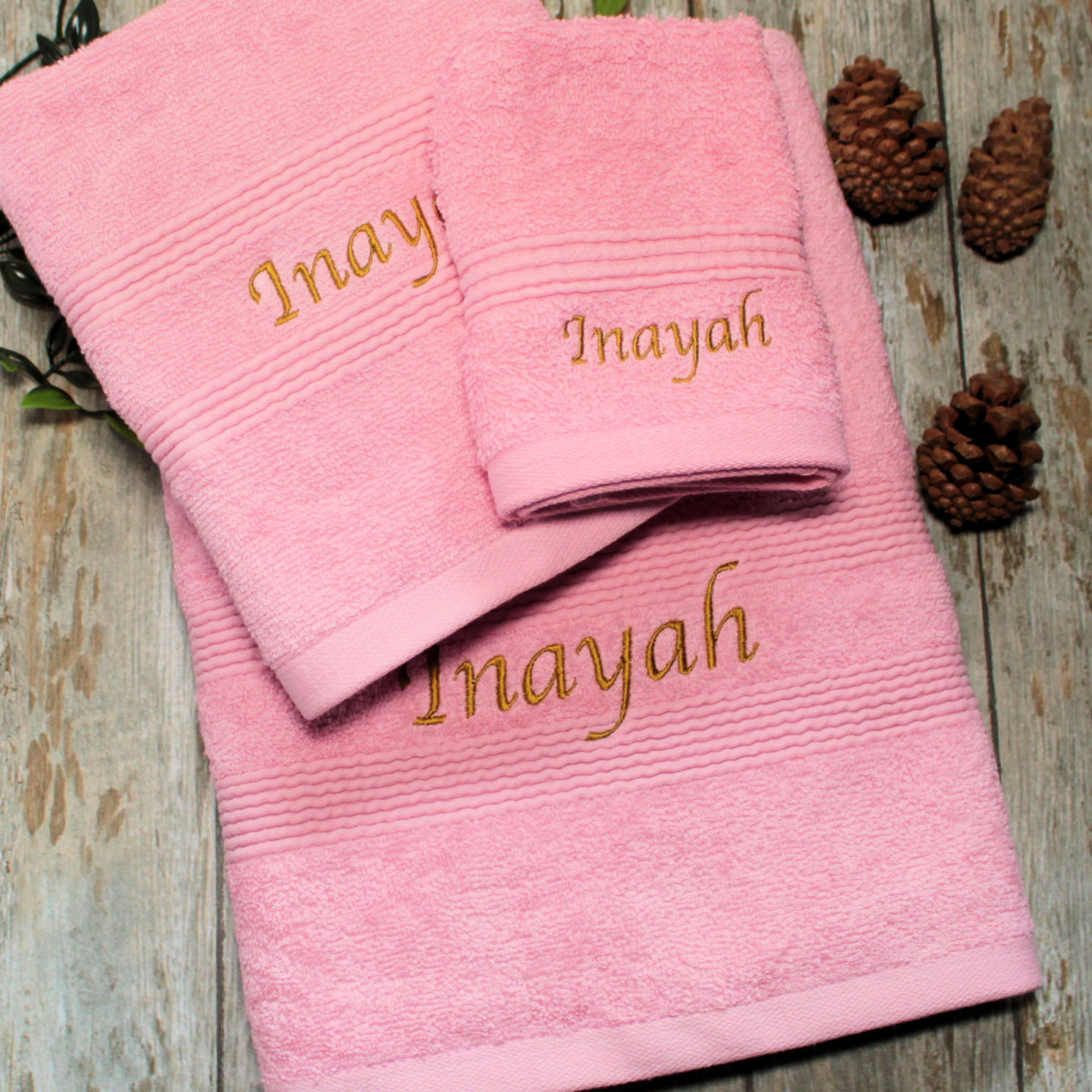 Tags: 3 pc pink towels, personalised towels set, personalised towel bale, personalisation bath towels towel sets hand face cloth flannel wedding gift bathroom towels