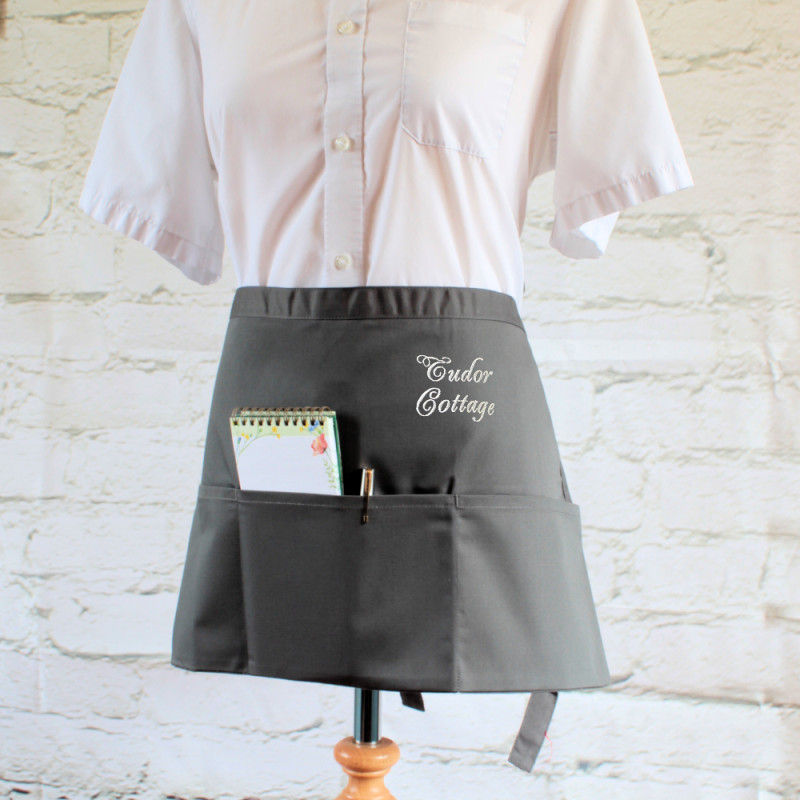 Personalised grey waist apron with three front pockets great for those in catering, hosting or salons.