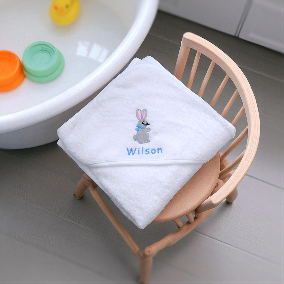 White hooded baby towel cuddle robe featuring exclusive embroidered bunny rabbit design and you can choose to have made