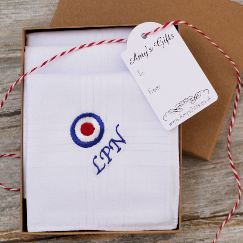 Three cotton handkerchiefs personalised with a name or initials of your choice and featuring the Royal Airforce Roundel embroidery motif.